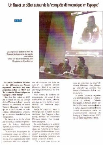Pour réussir le film La Conquête démocratique en Espagne, la classe de 3°3 du Collège André Malraux de Paron a interviewé notamment Jorge Semprún et François Solano, tous deux anciens Républicains espagnols puis résistants en France. Ils se sont notamment rendus à Madrid où ils ont été accueillis par le Lycée français, ainsi qu’à Paris, Montauban, Toulouse, Elne, La Vajol, Collioure, Rivesaltes et sur les plages d’Argelès, de Saint-Cyprien et du Barcarès. De nombreux partenaires, associations et musées, les ont beaucoup aidés et encouragés en leur prêtant de magnifiques archives. Ce projet a reçu le prix Vézelay 2006 Pour une Europe de la paix.