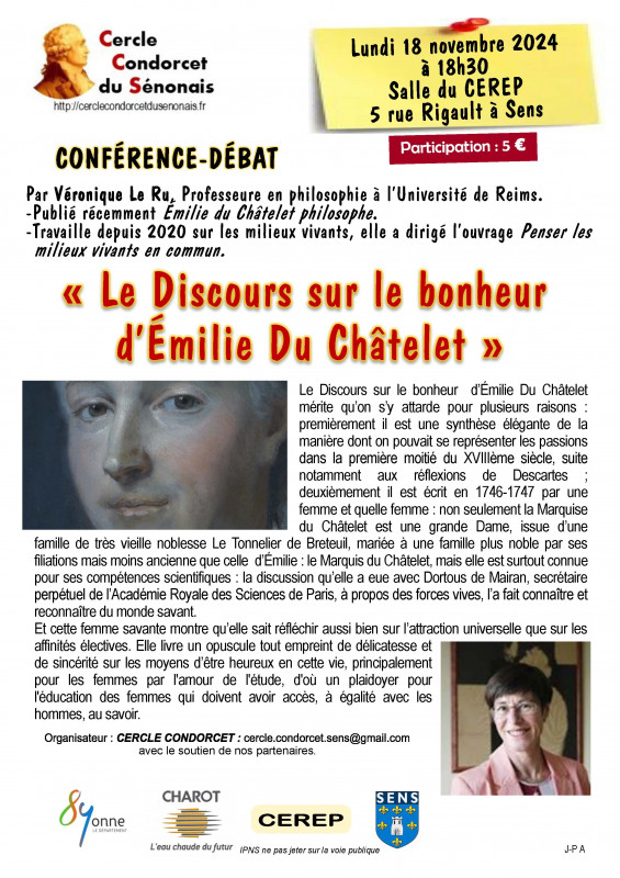 Le Discours sur le bonheur d’Émilie Du Châtelet mérite qu’on s’y attarde pour plusieurs raisons : premièrement il est une synthèse élégante de la manière dont on pouvait se représenter les passions dans la première moitié du XVIIIème siècle, suite notamment aux réflexions de Descartes ; deuxièmement il est écrit en 1746-1747 par une femme et quelle femme : non seulement la Marquise du Châtelet est une grande Dame, issue d’une famille de très vieille noblesse Le Tonnelier de Breteuil, mariée à une famille plus noble par ses filiations mais moins ancienne que celle d’Émilie : le Marquis du Châtelet, mais elle est surtout connue pour ses compétences scientifiques : la discussion qu’elle a eue avec Dortous de Mairan, secrétaire perpétuel de l’Académie Royale des Sciences de Paris, à propos des forces vives, l’a fait connaître et reconnaître du monde savant. Et cette femme savante montre qu’elle sait réfléchir aussi bien sur l’attraction universelle que sur les affinités électives. Elle livre un opuscule tout empreint de délicatesse et de sincérité sur les moyens d’être heureux en cette vie, principalement pour les femmes par l'amour de l'étude, d'où un plaidoyer pour l'éducation des femmes qui doivent avoir accès, à égalité avec les hommes, au savoir.